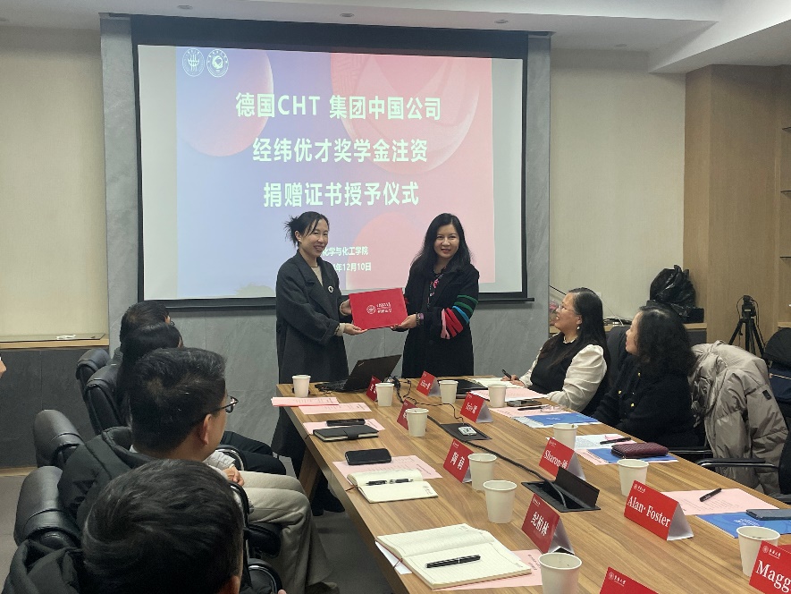 (为德国CHT集团中国公司授予经纬优才奖学金注资捐赠证书)