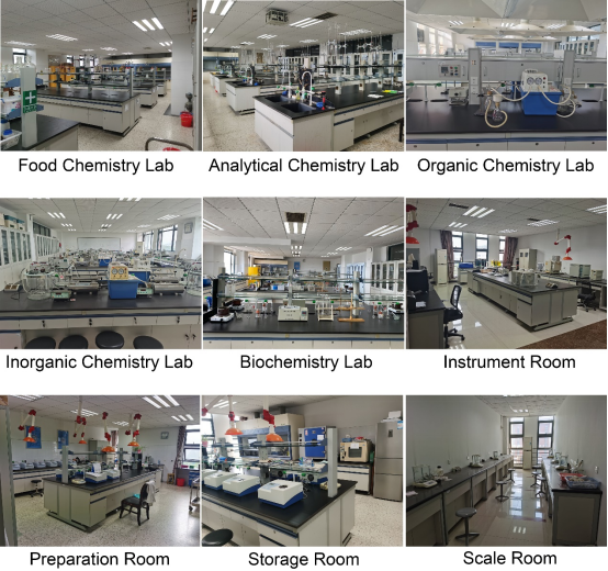 The laboratory section has a large number of equipment for different chemical experiments, including electronic balances, temperature-controlled water baths, ultra-pure water purifier, pH meters, melting point apparatuses, rotary evaporators, centrifuges, drying ovens, conductivity meters, UV-vis spectrophotometers, fluorescence spectrometer, Kjeldahl nitrogen analyzer, microwave digestion system, liquid chromatograph, gas chromatograph, gas chromatograph- mass spectrometry, etc.
