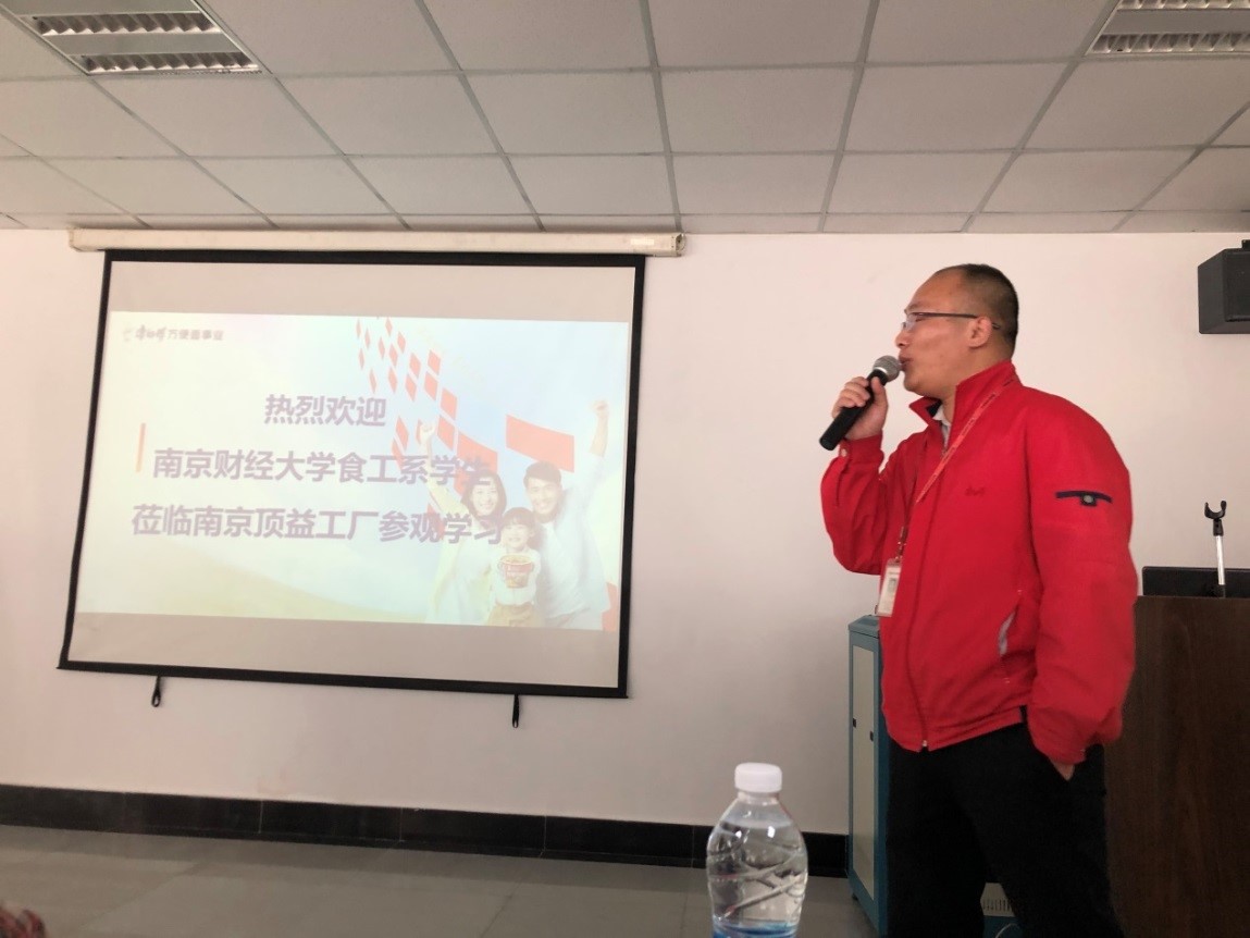 南京顶益食品有限公司位于南京市江宁经济技术开发区将军路647号,是隶属于顶新国际集团的康师傅方便食品有限公司,经营范围主要是用粮食、蔬菜、禽畜加工生产方便面及其调味料,销售自产产品。同学们在工作人员的带领下,首先参观了公司方便面制作车间。工作人员介绍说,康师傅从面粉、油料等原材料的精挑严管入手,将食品安全作为公司的立命之本,例如油炸油精选马来西亚进口棕榈油,对运输和储存环节进行严格管理,生产过程中采取130℃低温油炸技术,最大程度地减少面条油炸脱水时致癌物丙烯酰胺的生成风险,油炸采取一次性用油,拒绝“千滚油”,油烟废气经专业设备处理后再进行排放,减少环境污染。