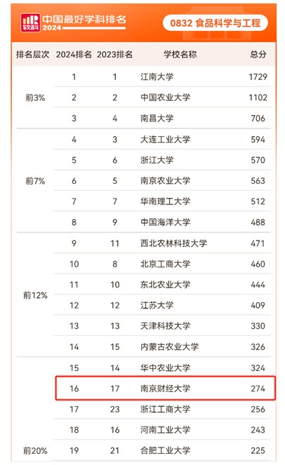 食品科学与工程学科排名再获佳绩,位列第16位,排名前20%。