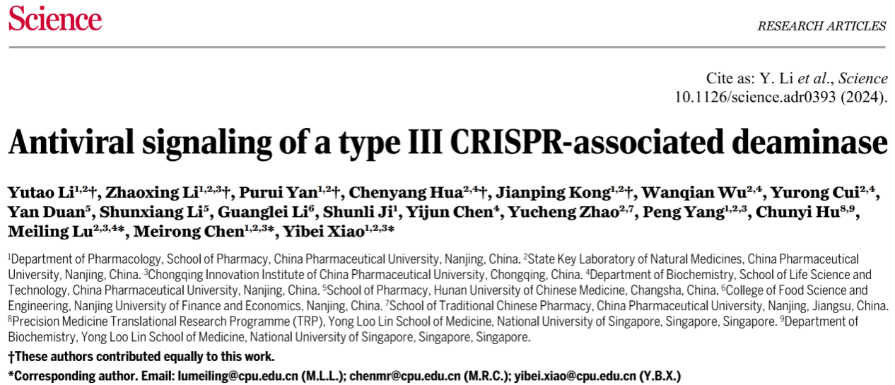 青年教师李光磊参与中国药科大学肖易倍教授团队牵头的CRISPR-Cas调控ATP消耗抗病毒机制研究,在国际顶级期刊Science上发表了题为Antiviral signaling of a type III CRISPR-associated deaminase的研究论文,置地娱乐场
