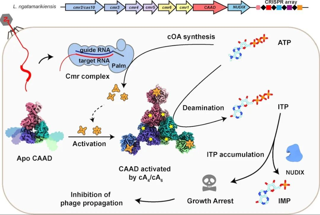 该研究报道了III型CRISPR cas调控的ATP耗竭的抗病毒机制,其中CRISPR-cas相关的腺苷脱氨酶(CAAD)在被cA4或cA6激活后将ATP转化为ITP,通过耗竭ATP导致细胞生长停滞从而抑制病毒扩散。在消除感染后,Nudix水解酶将ITP水解为无毒的IMP使细菌恢复生长。结合冷冻电镜结构和生化证据,研究阐明了CRISPR-CAAD系统耗竭ATP实现免疫的分子机制。置地娱乐场