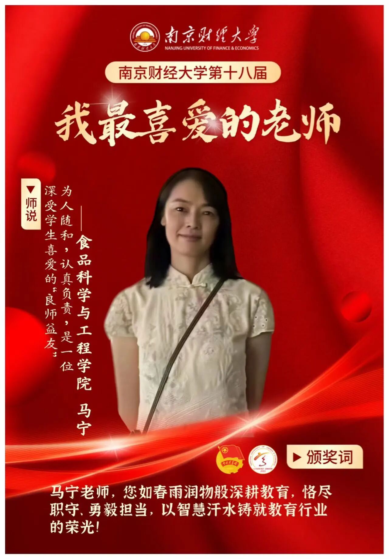学生会汇总投票、多部门联合审查等环节。马宁老师作为专任教师代表,其当选展现了其在学生中的高认可度和影响力。 马宁老师长期致力于教学改革与科研创新,主持国家自然科学基金等多项课题,在Journal of Agricultural and Food Chemistry等高水平期刊发表论文20余篇,并荣获授权国家发明专利。在学生眼中,她既是严谨的学术引路人,也是关爱学生成长的良师益友,其课堂生动有趣、深入浅出,课后常与学生交流学术动态与生涯规划,深受历届学生好评。