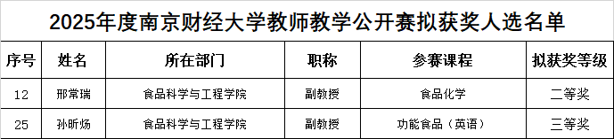 两位教师凭借出色的教学表现荣获佳绩。其中,邢常瑞老师主讲的《食品化学》课程荣获二等奖,孙昕炀老师主讲的《功能食品(英语)》课程荣获三等奖。