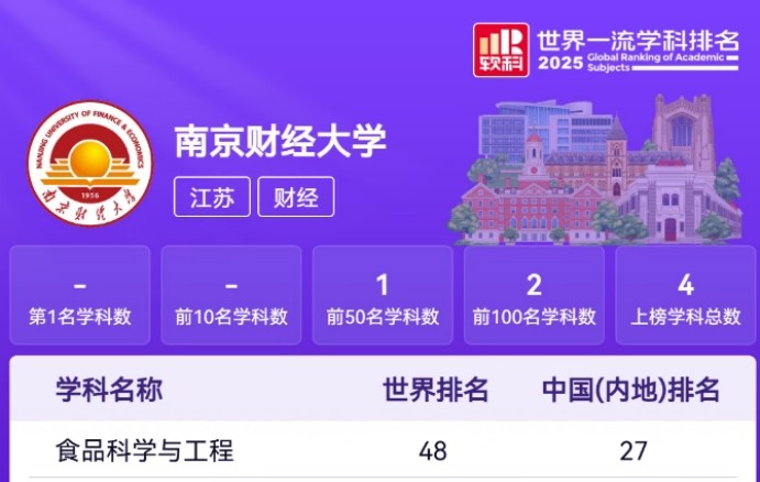 食品科学与工程学科实现历史性突破,全球排名首次跻身前50,位列第48位。