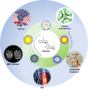 右旋糖酐及其衍生物作为天然多糖,在医药应用的递送系统开发中得到了极大的关注。近年来,许多基于右旋糖酐的递送系统被开发出来,包括自组装胶束和纳米粒子、纳米乳液、磁性纳米粒子、微米粒子和水凝胶。本综述的第一部分讨论了右旋糖酐及其各种化学修饰衍生物与递送体系密切相关的物理化学性质。然后,论文重点介绍了右旋糖酐递送体系的制备策略及其胶体性质,如颗粒直径、表面电荷、形貌以及药物释放机制等。最后,论文总结了右旋糖酐药物递送系统在生物医学中的应用,详细阐述了其生物学功效和作用机制,包括癌症治疗、磁共振成像、胰岛素口服递送、脊髓损伤治疗、细菌皮肤感染治疗等。此外,论文还分析了右旋糖酐作为药物递送体系面临的主要问题以及未来的研究趋势。