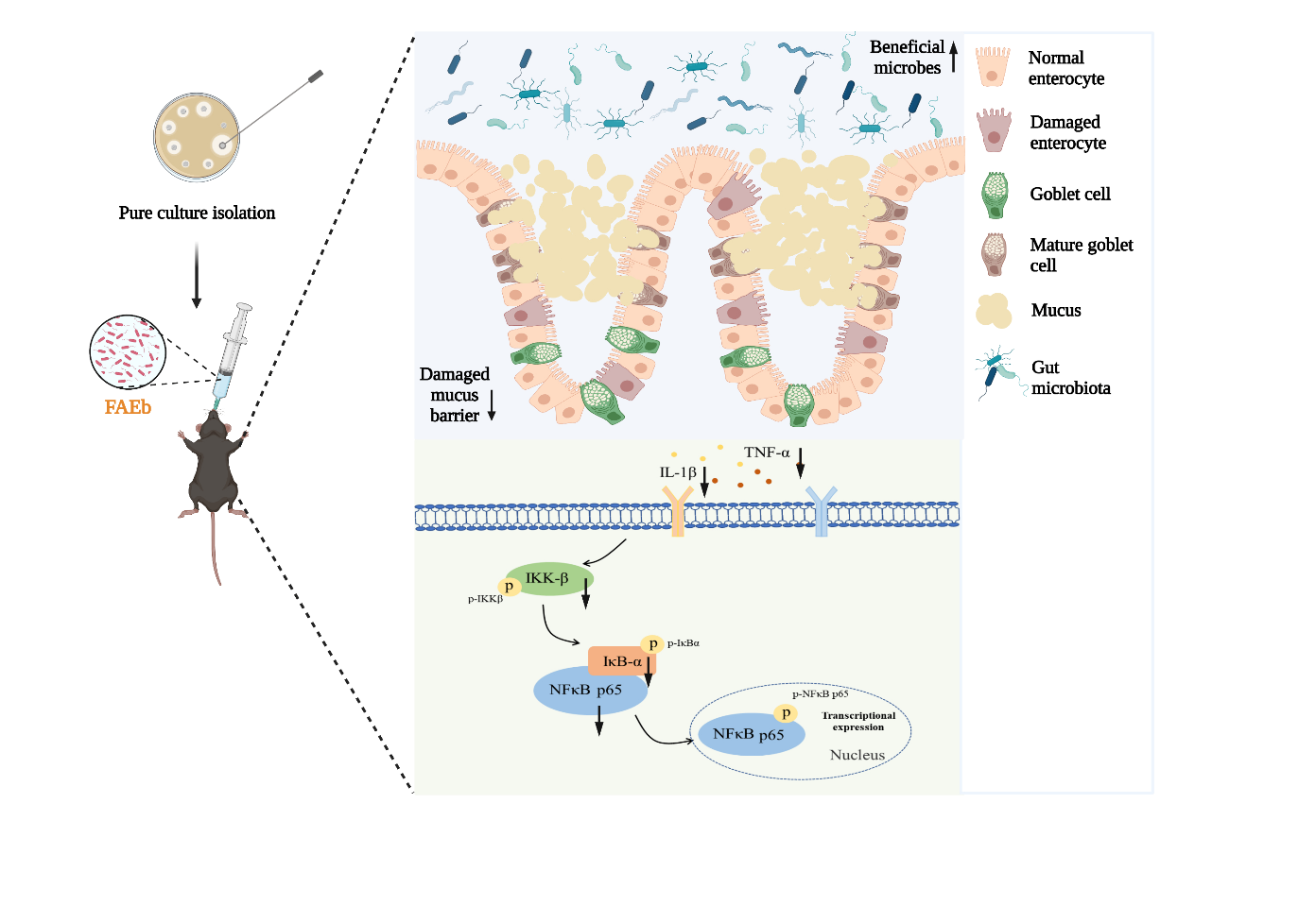 研究发现,相对MD模型组,FAEb摄入能显著缓解UC小鼠体重的下降和减轻结肠组织的病理损伤程度,并且能降低血清中促炎细胞因子的水平和提升结肠组织中抗氧化酶的活性。而且,FAEb的摄入能明显上调肠道菌群(Bacteroidetes、Bifidobacterium和Lactobacillus johnsonii)的相对丰度,调节肠道微生物结构组成。另外,FAEb摄入能促进结肠组织中紧密连接蛋白Claudin-1和ZO-1的mRNA表达,对改善肠粘膜上皮机械屏障和肠道通透性起着重要作用。尤其是,FAEb摄入能明显调节IKK-β、IκB-α和NFκB-p65的表达。综上结果分析,产FAE菌分泌的FAE可能水解肠道内的酯化物,产生具有抗炎、抗氧化作用的阿魏酸和低聚糖,然后,发挥抗炎作用,增强肠黏膜屏障,调节肠道微生物结构,抑制NF-κB炎症信号通路活性,从而达到缓解溃疡性结肠炎的效果。具体的改善机制有待进一步探索和研究,但不可否认的是,产FAE的约氏乳杆菌可以作为预防和治疗UC的膳食补充剂。
