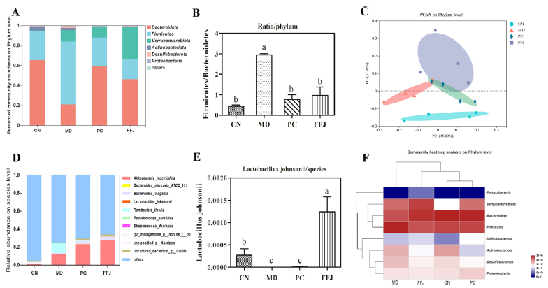 在本研究中,从正常小鼠的粪便中筛选分离得到产FAE菌,经过鉴定,是一株产FAE的约氏乳杆菌(FAEb)。然后,将菌剂灌胃给葡聚糖硫酸钠(DSS)诱导的UC小鼠,探究其对UC小鼠的作用机制。研究人员将32只小鼠分为四组:CN和MD组每天灌胃0.4 mL 0.85% NaCl溶液;PC组每天灌胃0.4 mL柳氮磺胺吡啶溶液(50 mg/kg/day);FFJ组每天灌胃0.4 mL的FAEb菌液(5×109 CFU/mL)。经2周饮食干预后,将MD、PC和FFJ组的饮用水换成2%DSS溶液(每2天换新),DSS诱导一周后处死小鼠。