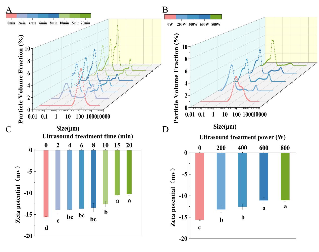 图3 超声处理后麦胚蛋白粒径和电势变化