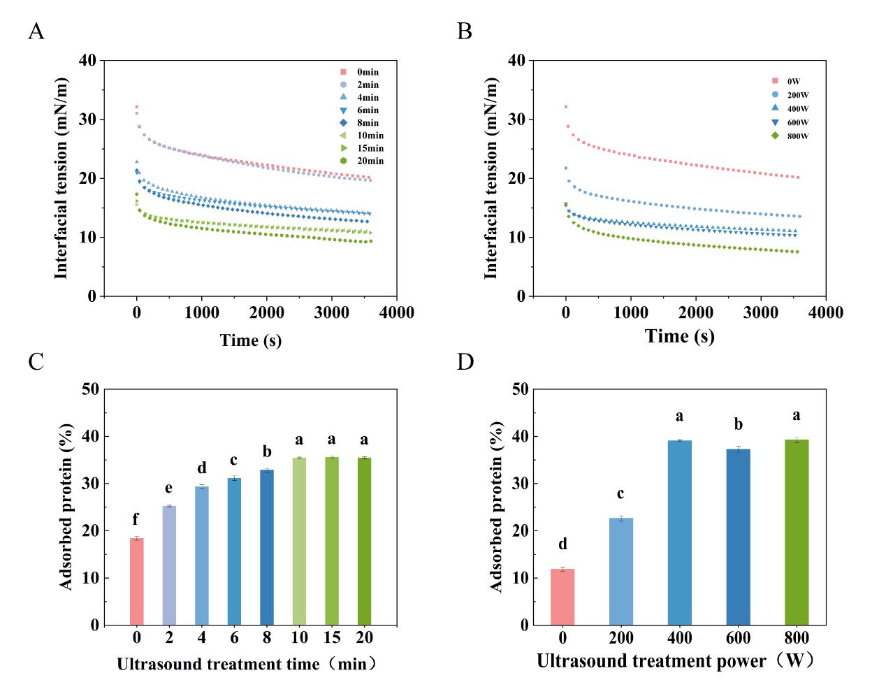 超声是近期研究者比较青睐的技术,它具有高效、重现性高、低成本、操作简单、污染最小等优点。因此,本研究首先采用碱提酸沉法提取麦胚蛋白,并探究不同超声功率(0、200、400、600、800W)和不同超声时间(0、2、4、6、8、10、15、20min)对麦胚蛋白溶解性、乳化性(乳化活性、乳化稳定性)的影响。测定超声后麦胚蛋白在油-水界面的吸附以及超声后麦胚蛋白的结构变化(蛋白粒径、疏水性、自由巯基含量、内源荧光光谱、傅里叶红外光谱、不同条件下的分子量、微观结构)。最后,结合乳化特性变化、界面蛋白吸附、蛋白质结构变化分析超声处理改善麦胚蛋白乳化特性的机理。