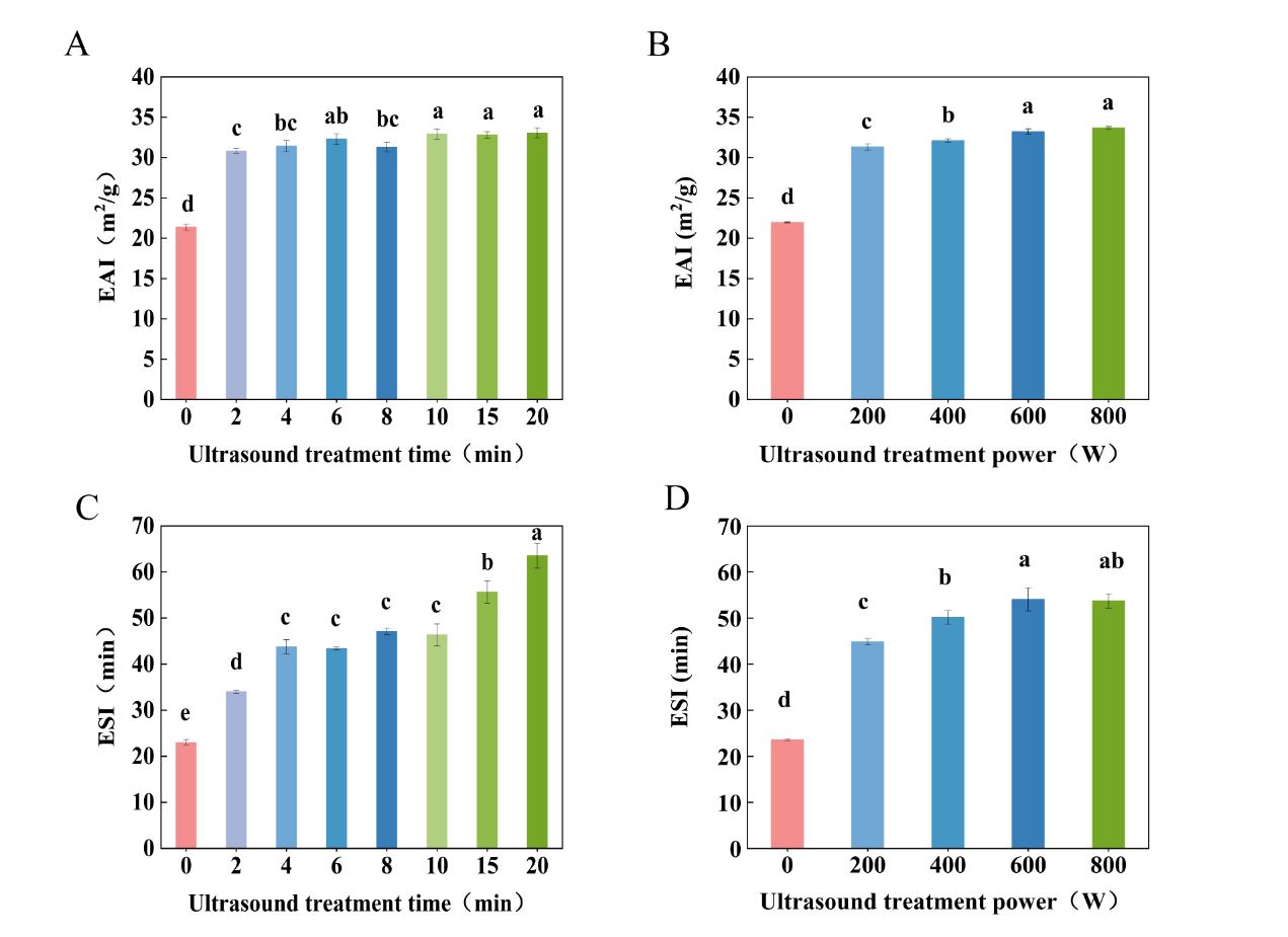 本文系统探究了碱提酸沉法提取的麦胚蛋白的乳化活性和乳化稳定性,并首次探究了超声处理是否可以提升其乳化特性以及潜在的机理。