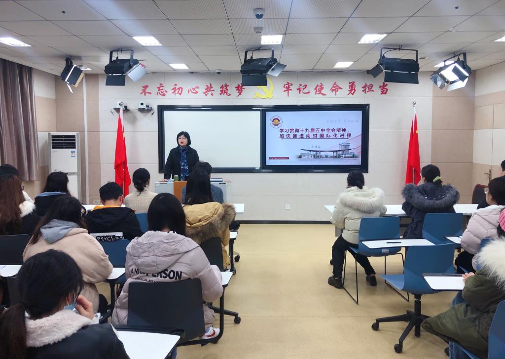12月29日,校党委常委、副校长邱伟芬教授在工科楼214教室讲授题为“学习贯彻十九届五中全会精神暨加快推进南财国际化进程”的专题党课,置地娱乐场 部分教师党员代表,全体本科生和研究生党员参加课党课学习。党课由置地娱乐场 党委副书记周进进主持。