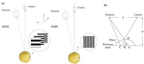 水果曲面轮廓对利用空间频域成像(SFDI)技术测量吸收系数(μa)与约化散射系数(μ’s)有很大影响。在本研究中,使用已开发的结构光成像系统进行相位测量轮廓术(PMP)的检测,以获得被测物体的表面高度。对平面和球面几何模型进行蒙特卡罗(MC)仿真,根据仿真结果确定漫反射率(Rd)校正公式,并用标准反射板进行验证。使用五个半球形固体仿体验证所提出的Rd校正方法对估算μa和μ’s计算结果影响,结果表明,两个参数精度和均匀性都得到了显著提高,相对误差范围分别为0.78%-11.84%和2.83%-8.95%,校正后的μa和μ’s的标准偏差范围分别为1.89×10-5 - 1.42×10-3 mm-1和1.76×10-4 - 8.17×10-3 mm-1。最后,将所提出的Rd校正方法用于梨机械损伤检测中,对正常梨和损伤梨的μa和μ’s图谱进行了比较。结果表明,在Rd校正前,正常梨轮廓最高点附近的区域容易被识别为损伤区;校正后,正常梨的μa和μ’s图更为均匀,损伤梨的损伤区域更为突出。本研究中提出的轮廓校正方法,结合SFDI技术,对于精确测量梨组织的μa和μ’s至关重要,从而减少梨损伤检测时的误判。
