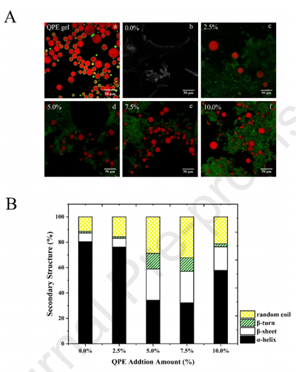 此外,随着QPE添加量从0.0%增加到7.5%,α-螺旋含量逐渐降低,而β-折叠、β-转角和无规卷曲的含量逐渐增加。此外,QPE的添加增加了总巯基和二硫键的含量,促进了二硫键构象由gauche-gauche-gauche向gauche-gauche-trans的转变。添加QPE后,MP凝胶的静电相互作用、氢键和疏水相互作用显著增强。