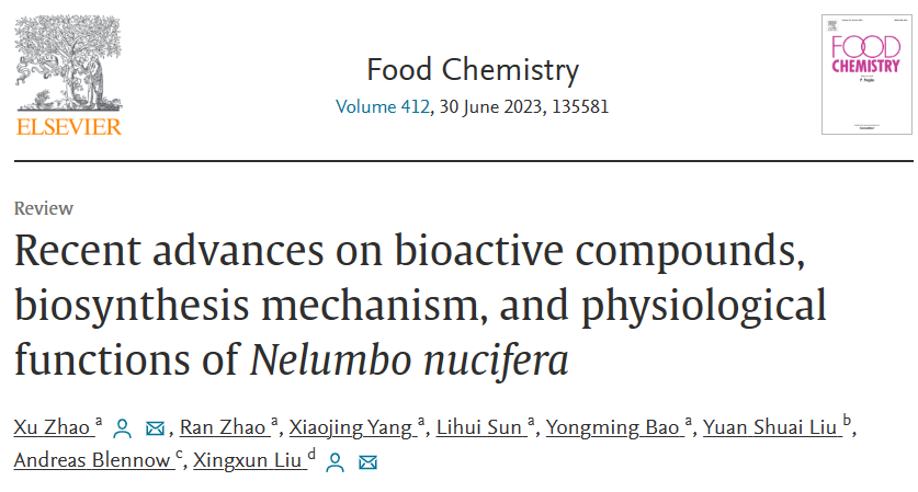 刘兴训研究员(通讯作者)在国际期刊《Food Chemistry》(JCR一区,IF=9.231)上发表题为“Recent advances on bioactive compounds, biosynthesis mechanism, and physiological functions of Nelumbo nucifera”的高水平综述。