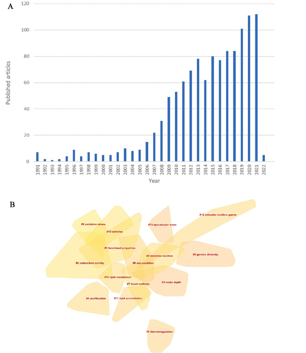 在亚洲传统医学系统中,莲花的不同部位和器官,包括叶子、叶柄、花蕾、花茎、花瓣、花托、雄蕊、花蕊、果皮、籽壳、种皮、种子、胚、藕和藕结,被用于治疗炎症、癌症、皮肤病、神经系统疾病、麻风病和中毒。许多生物活性化合物,如类黄酮、生物碱、脂类、糖苷、三萜、维生素和碳水化合物已从莲花中被分离出来。近年来,大多数研究集中在荷花中的类黄酮、生物碱和脂类,在Web of Science中检索主题为“荷花,类黄酮”、“荷花,生物碱”和“荷花,脂类”的研究文章分别获得了157、184和111个点击率。