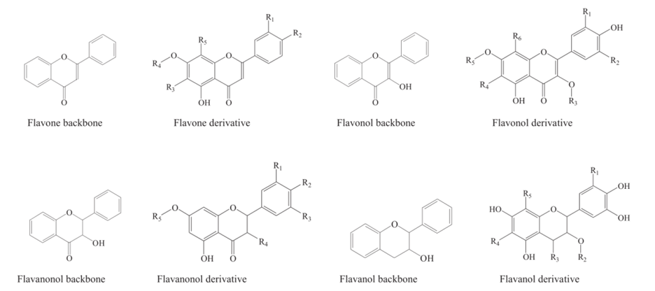图2 莲花中发现的黄酮、黄酮醇、黄烷醇和黄烷醇的基本结构