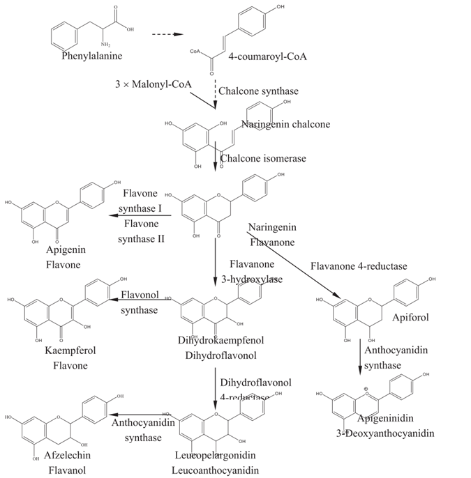 图3 黄酮生物合成的苯丙类代谢途径体系(b环羟基化步骤未显示)