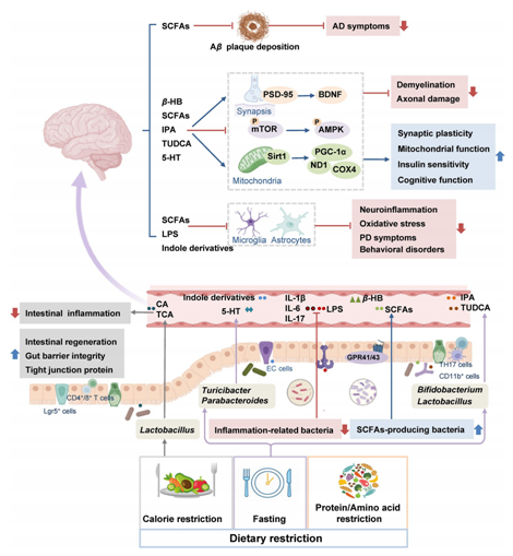 图3. 饮食限制通过菌群-肠-脑轴对脑功能产生有益影响的分子机制