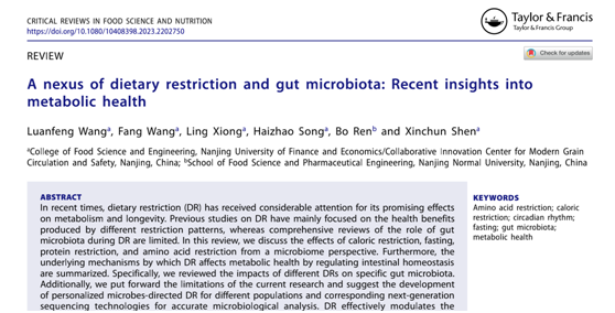 青年教师在国际食品领域顶级期刊《Critical Reviews in Food Science and Nutrition》(中科院1区TOP期刊,IF=11.208)上发表题为“A nexus of dietary restriction and gut microbiota:Recent insights into metabolic health”的综述论文,全面阐述了基于代谢健康调控的不同饮食限制模式与肠道菌群之间的关系。