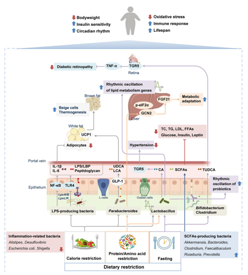 图2. 饮食限制通过肠道菌群对宿主代谢产生有益影响的分子机制