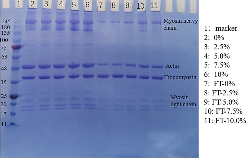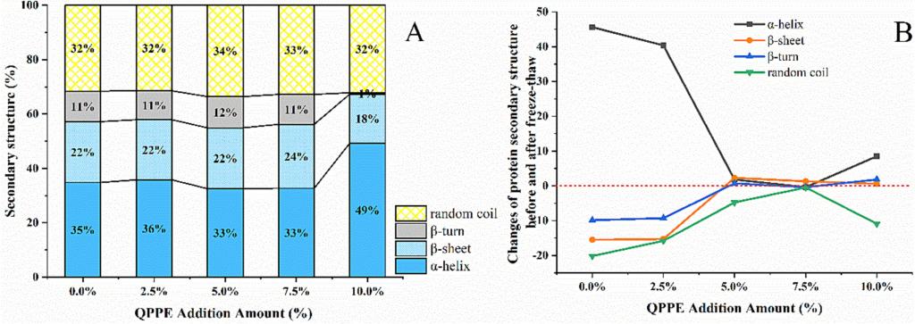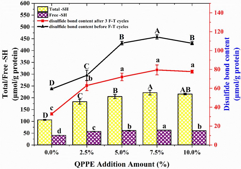 SDS-PAGE结果表明,5.0%~10.0% QPPE的加入减缓了蛋白质的降解。同时,5.0%~7.5%的QPPE在F-T循环后保持了MPG蛋白质二级和三级结构的稳定性。添加QPPE后,巯基、二硫键和二酪氨酸含量增加。