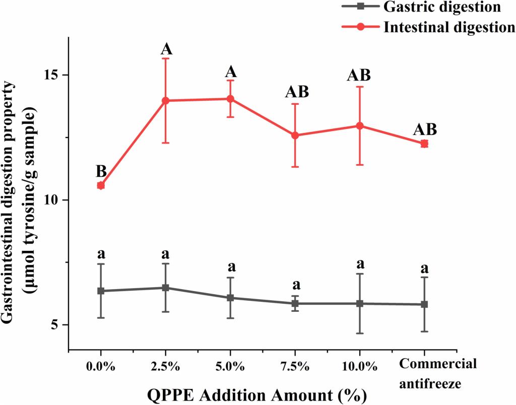 该研究表明,7.5%的QPPE提高了MPG的F-T稳定性,减少了F-T处理引起的蛋白质变性和氧化,对MPG的消化性能没有不利作用。研究结果为QPPE在鱼类蛋白凝胶中的应用提供了理论支持,QPPE可作为一种绿色、有效的防冻剂应用于肉类行业。