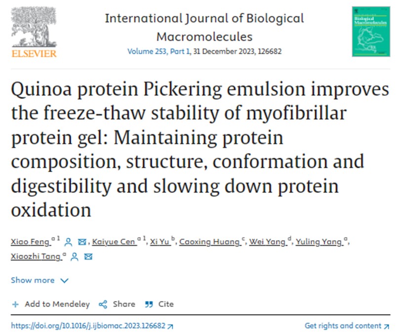 冯潇、汤晓智(通讯作者)在国际TOP期刊International Journal of Biological Macromolecules(Q1,IF: 8.2)发表题为“Quinoa protein Pickering emulsion improves the freeze-thaw stability of myofibrillar protein gel: Maintaining protein composition, structure, conformation and digestibility and slowing down protein oxidation”的研究性论文。
