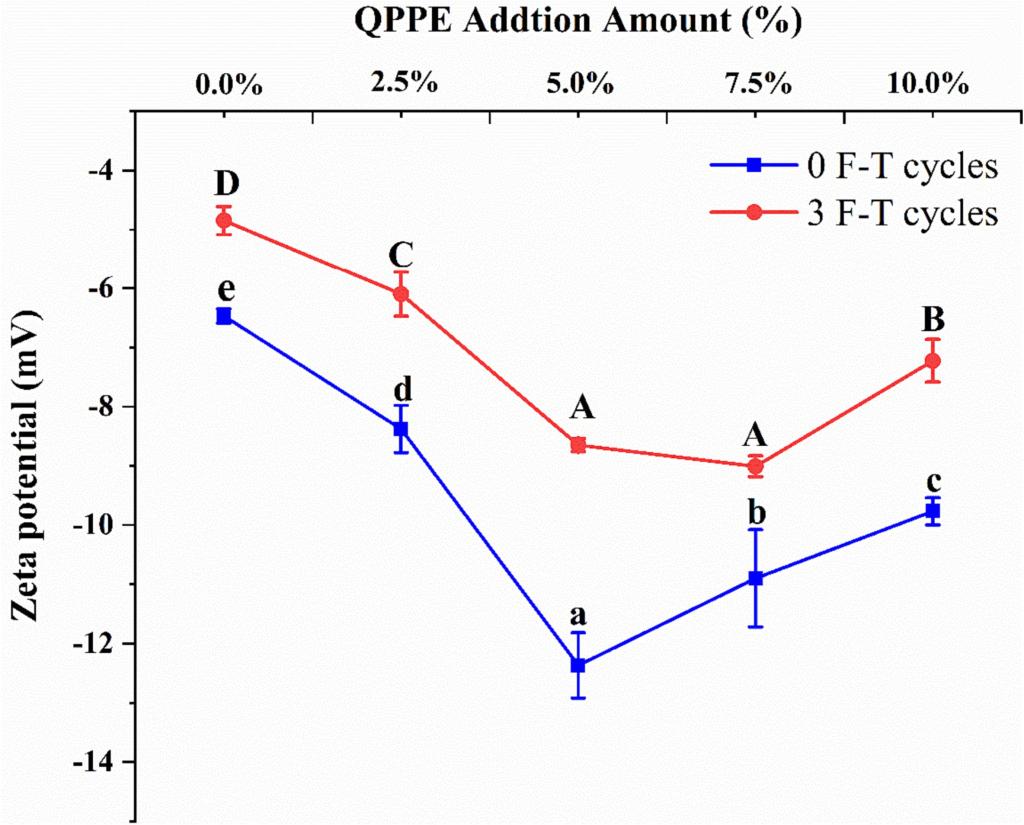 此外,与其他组相比,含5.0%和7.5%QPPE的MPG显示出明显更高的ζ-电位值,QPPE增强了MPG中的静电相互作用和交联,并减少了F-T处理引起的蛋白质聚集和氧化。此外,QPPE没有影响MPG的消化率。