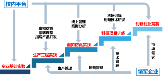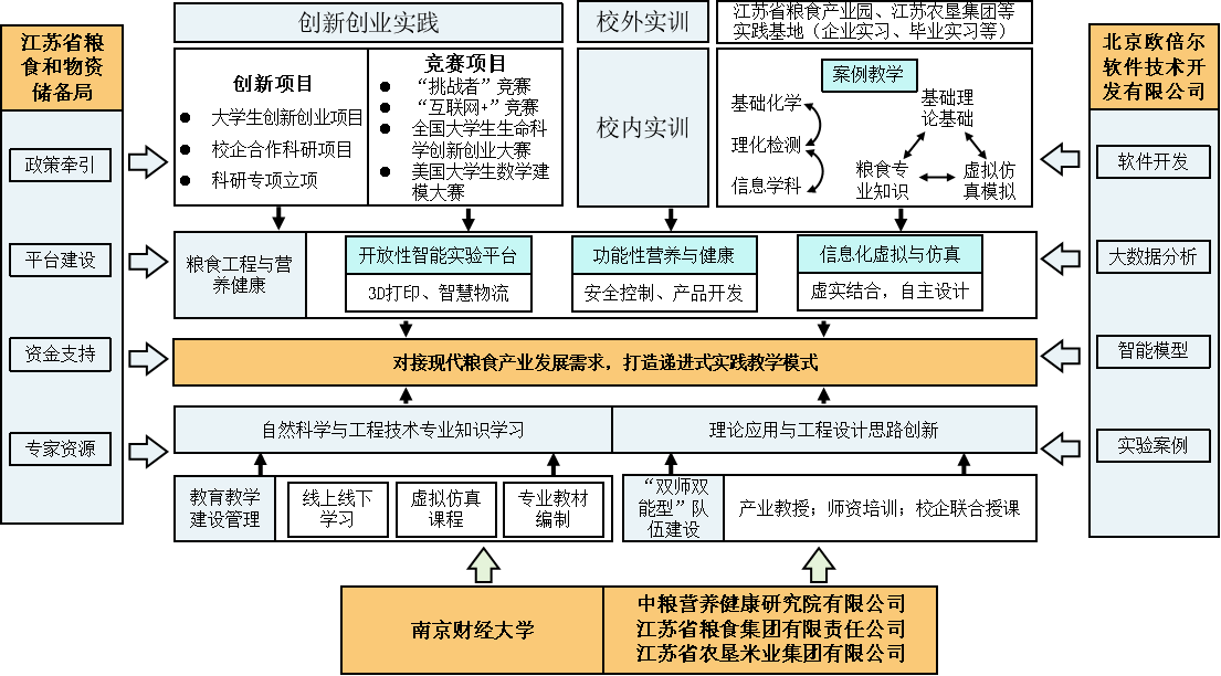 体系重构:依托国家粮食储运工程实验室、食品工程与质量安全国家级实验教学示范中心等32个融合平台,通过整合校企资源,建设了以教学、科研、培训为一体的江苏省现代粮食工程与营养健康重点产业置地娱乐场 ,以及一批高质量实验实训基地,打造“置地娱乐场 -企业-行业”联动式创新能力训练模块,完善学生实践能力培养体系(图4)。校企协同构建“专业基础实验、生产工程实践、虚拟仿真实践、科研项目训练、创新创业竞赛”五阶实践教学链,100%的学生参与一到三阶实践,85%的学生参与四到五阶实践。